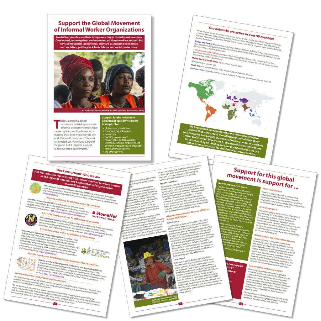 Luckham Creative designed this 12 page brochure recently for a consortium of five global networks, including Women in Informal Employment: Globalizing and Organizing (WIEGO), representing informal economy workers in over 90 countries. This was a nice piece to work on as I was asked to contribute some of my photographs, the front cover photo was one I took while in Accra, Ghana with a group of Waste pickers, and another of a waste picker in Belo Horizonte, Brazil. Click on the image above to view it larger.